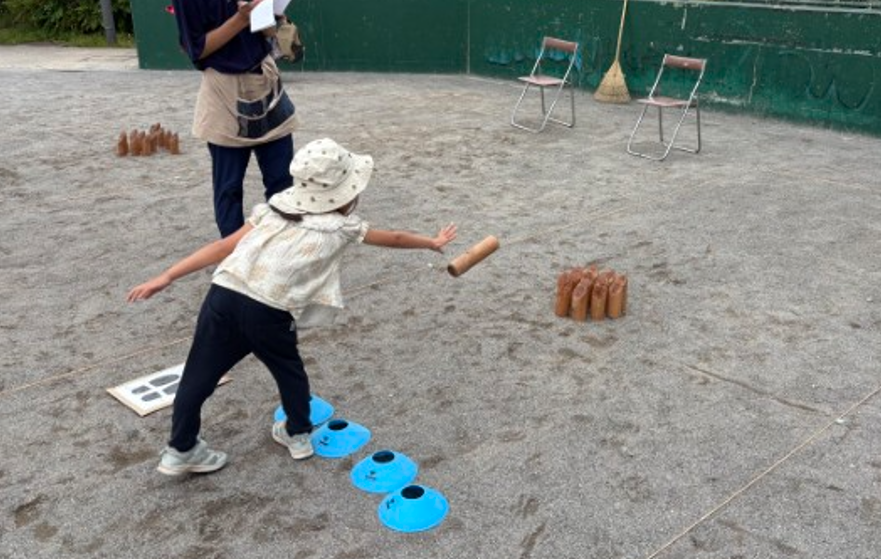 ただ、木の棒をまっすぐ狙ったところに投げるのはなかなか難しく、距離は届いているけど、的に当たらない・・・て子もいました。
