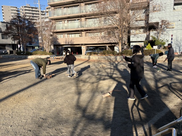 まずはモルック棒を投げて腕ならしして投てき感覚の確認。あまりに寒いので始めのうちは身体がうまく動かずなかなか調子があがりません。
